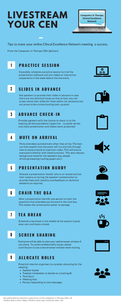4. Allocate a speaker buddy so that everyone can be muted during presentations except apart from the speaker and them. The buddy can then alert a speakers if something was difficult to see/hear and the speaker can check with the buddy if they are concerned something isn’t appearing as it should for the audience.